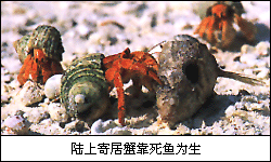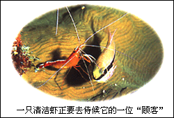 有些甲壳动物用与其它动物搞协作的办法得到食物。清洁虾用它细长的螯,从鱼的皮肤上捡取死皮和寄生虫食之,鱼类能辨认出清洁虾的颜色,它们常常排队等候着被清理。 |