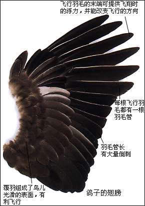 鸟类是世界上唯一长有羽毛的动物,羽毛不仅帮助鸟飞翔,同时也可保暖。鸟的羽毛主要有三种:尾巴和翅膀上用于飞翔的毛,覆盖全身使身体呈流线型的羽毛,以及体表的绒毛。每一根有飞行功能的羽毛都有一根羽毛管,上面有成百的倒刺,它们连接在一起组成光滑的表面。蓬松的绒毛则可使暖空气不致很快散去。