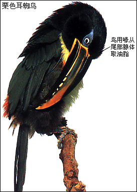 鸟类经常整理自己的羽毛,除了有清洁作用之外,也可以弄走寄生虫。一些鸟在水中淋浴,另一些则用沙土代替了水。整理羽毛时,鸟儿用喙像梳子一样梳理羽毛。很多鸟都能将一种油样的液体涂在羽毛上以达到防水的效果,这种油脂由鸟类尾根部的特殊腺体分泌出来。