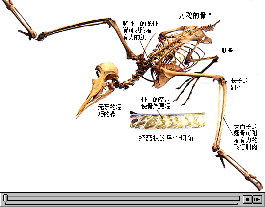 鸟类的骨架是力量和轻巧的完美结合。为了减轻重量,很多鸟类的主要骨架都是中空的,即使不是如此,也会含有大量空气。鸟类的翅膀和腿骨尤为有力,而强劲有力的肌肉则附着在胸骨上一块叫龙骨脊的骨头上。