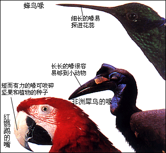 鸟类动物的喙形状及大小由它们所吃的食物而定。鸟儿的喙有很多作用,最主要的是捕食、整理羽毛和筑巢。一些鸟,如鹦鹉还用喙帮助它们爬行。