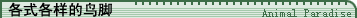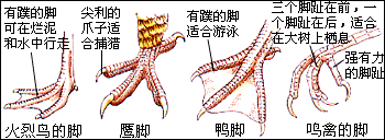不同类型的鸟的脚差异很大。生活在浅水里的鸟腿略长而脚上有蹼,适合在水中前行。飞得较高的鸟的脚都很小,可以减轻空气中的重量。鸭、塘鹅和鸥的脚都有蹼,以利于划水。而一些猛禽都有尖利的爪子,利于捕捉动物。