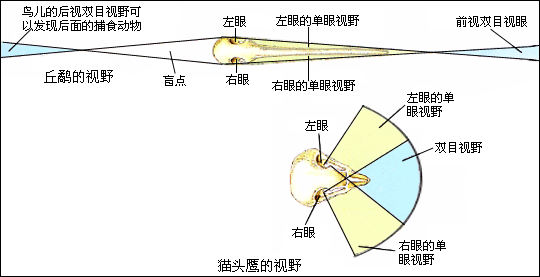 鸟的目光锐利,帮助它们更好地捕食、发现敌情以及飞翔。猎食类的鸟,如猫头鹰,两只眼睛都长在头的前部,视野虽然很窄,双目交叉视野却很大,这可以使它们在捕食时很好地判断距离。而另一些鸟,如丘鹬,两只眼睛在头的两侧分得很开,这样,它们极宽的视野很容易极早发现"敌情"。