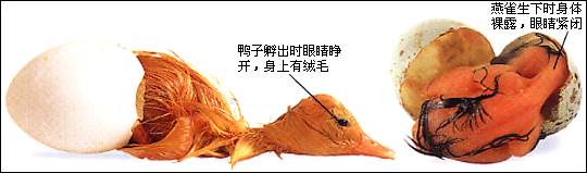 幼鸟有两种。一种生下来时眼睛就已睁开,身上有一层保暖的绒毛,几小时后就能自己寻找食物,如小鸭;另一些则眼睛紧闭,光着身子,它们必须在巢里呆上几个星期,完全依靠父母生活,如燕雀等。