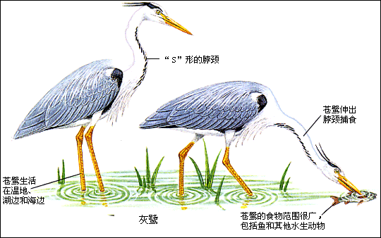 世界上目前约有60种苍鹭,它们通常住在水边,巢筑在地面。苍鹭单独捕食,它们耐心地等待猎物出现,然后猛地咬住它。苍鹭的脖颈呈"S"状,这使它们伸出脖颈捕食时,弯曲的脖颈能像弹簧一样有力