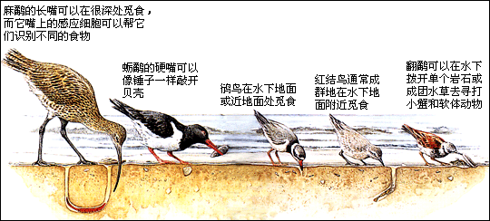 不同种类的涉水禽鸟往往在一起捕食,它们嘴的形状和长度各不相同,这使它们捕食的食物也各不相同,不至于为了食物抢起来。嘴短些的鸟,如鸻科鸟,只能在水下泥地表面觅食,而长着刀片一样嘴巴的蛎鹬,能用嘴打开贝吃里面的肉。麻鹬能用它们长长的嘴找寻埋在水面地下的食物。