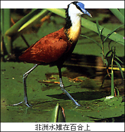 非洲水雉以它们的长腿、脚和爪子闻名,这使它们能在百合等漂浮的植物上行走而不沉入水底。除此之外,水雉也可以游水和飞行。生育季节,雄水雉在漂浮的蔬菜上筑简单的窝,在交配后,雄水雉会孵蛋并将幼雉喂大。