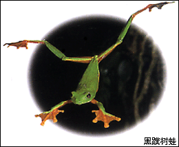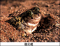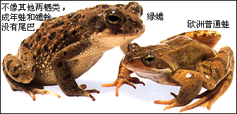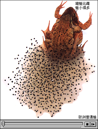 并非所有的蛙和蟾蜍留下受精卵让它们自己去孵化。有些种类能守护它们的卵子,保持卵子湿润并免遭敌害。这种雄性产婆蟾扛起一串卵子在背上,缠绕在它的腿上。当卵子预备孵化时,它把它们释放到水中。 |