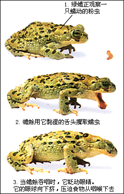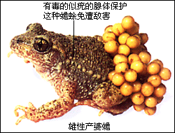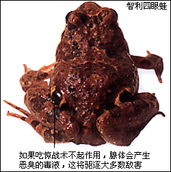 尽管蛙和蟾蜍不能咬伤或刺伤它们的敌害,它们运用许多别的装置去躲避敌害。当受到威胁时,智利四眼蛙转身显露毒腺,毒腺看起来像瞪着的眼睛。这使袭击者感到混乱和惊愕,给蛙一个跳离逃生的机会。 |