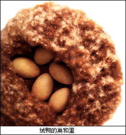 大多数水禽都将巢筑在蔬菜丰富且靠近水的地方。母鸭在地上先挖一个洞,然后用蔬菜铺出一个窝,最后,母鸭用腹部的绒毛盖在上面。这层绒毛在母鸭外出觅食时仍能使鸭蛋保持温暖。在觅食前,母鸭还将用更多的绒毛盖在蛋上面,以便不被其它的动物发现。人们常用绒鸭的毛制作绒线织物、睡袋等。 |
